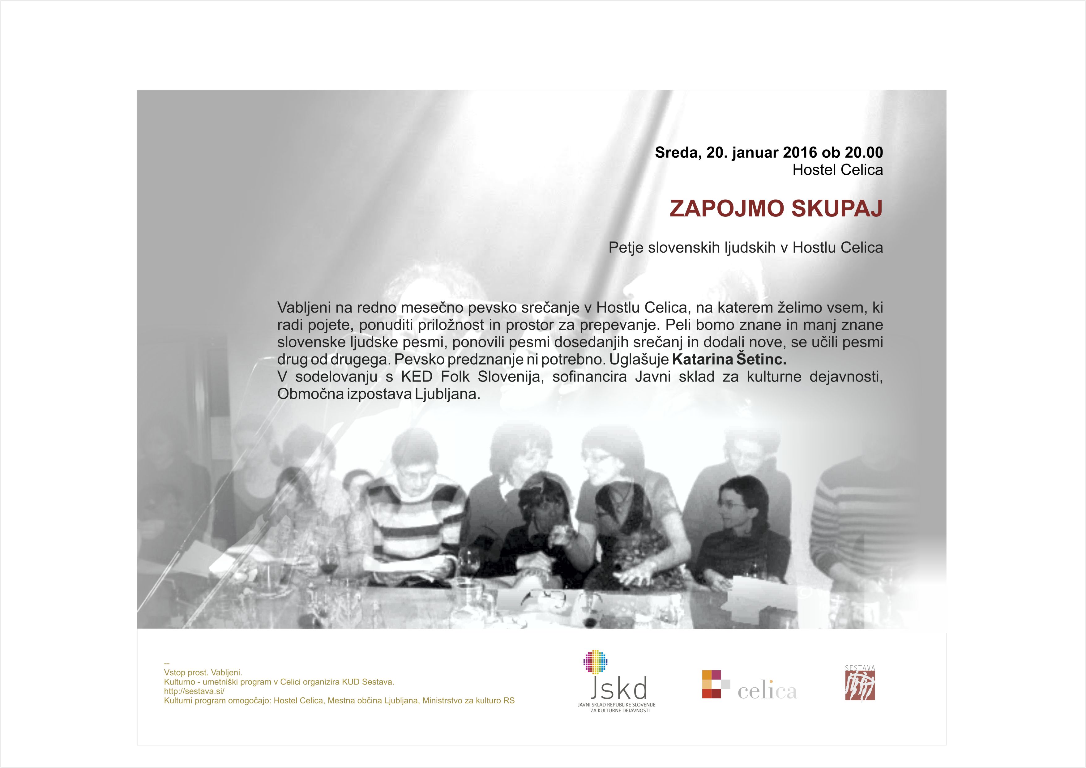 Vabljeni na redno mesečno pevsko srečanje v Hostlu Celica, na katerem želimo vsem, ki radi pojete, ponuditi priložnost in prostor za prepevanje. Peli bomo znane in manj znane slovenske ljudske pesmi, ponovili pesmi dosedanjih srečanj in dodali nove, se učili pesmi drug od drugega. Pevsko predznanje ni potrebno. Uglašuje Katarina Šetinc.